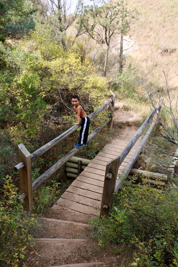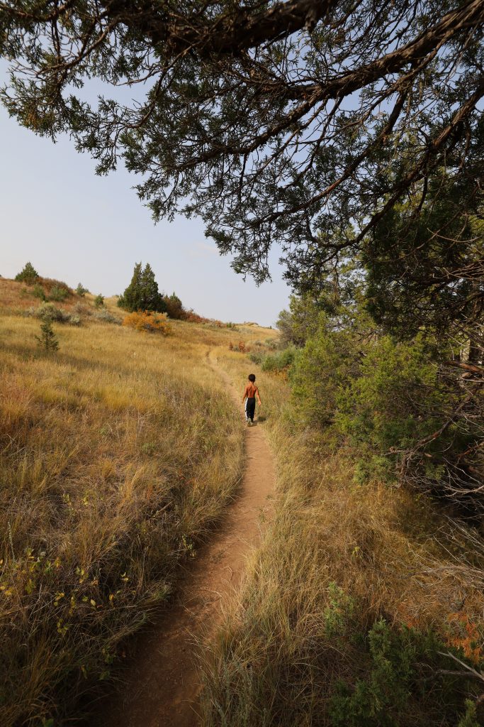 After this, we made a quick bathroom stop, saw wild horses in the distance, then backtracked out of the park, with a quick stop at the gift shop for a sticker (for me) and a stuffed buffalo (for Asher–so hard to say no to that kid!) I also changed out of my Wrangler jeans and into my hiking clothes.