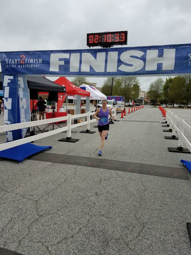 The last 5K was pretty tough, mentally and physically. I just didn’t feel good. I took walking breaks. I kept moving though, and tried to stay near a guy in front of me. That seems to help, to not feel so alone out on the course. There were volunteers scattered every half mile or so, and their cheers also helped. Lastly, the scenery was gorgeous, as all the trees and flowers are blossoming. I truly enjoyed the scent of spring, as it wafted fragrance (and likely pollen!) into my face for much of the race.