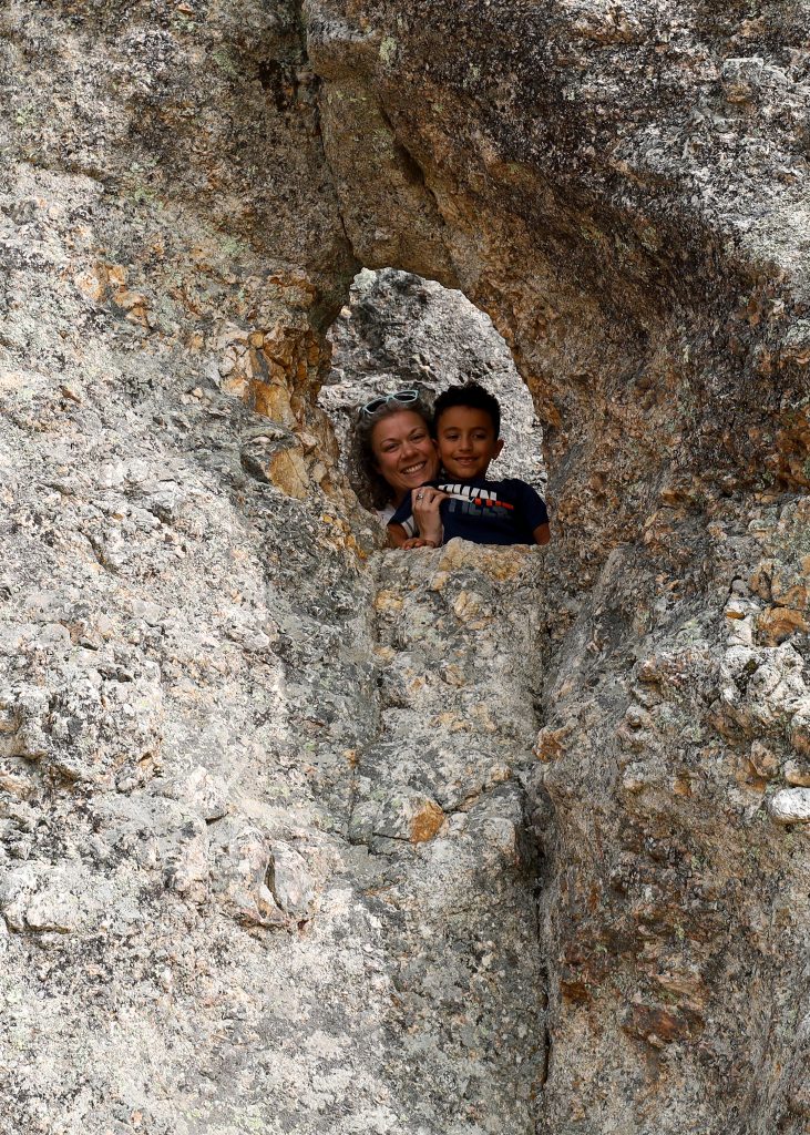 Our cabins weren’t ready when we arrived, so we dipped our toes in the water (COLD!), then played and climbed the stunning rock formations at (and in!) Sylvan Lake. Asher absolutely loved this–and even did all his climbing in sandals! I enjoyed it too, but climbing in sandals was a lot more difficult for me than for him 🙂
