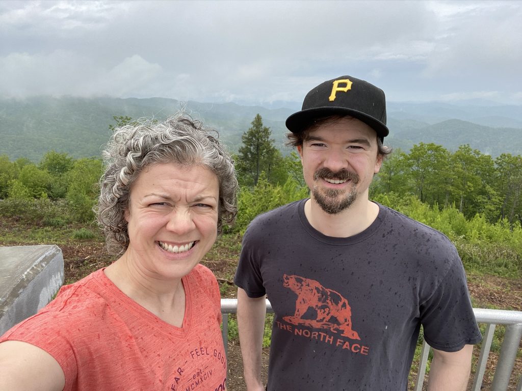 We got up around 7, and left after breakfast, at 8. We did a quick Dunkin’ Donuts stop for Joel to get coffee, then headed west on I-40 towards Asheville. Per usual, we chatted non-stop, and the 3 hours to our first stop passed in a flash–especially since we made no bathroom breaks. Our first stop was a quick detour: I had noticed Looking Glass Falls on the map, so close to Brevard, and wanted to stop there since we both love waterfalls! Plus, it was an easy stop, so close to the road.