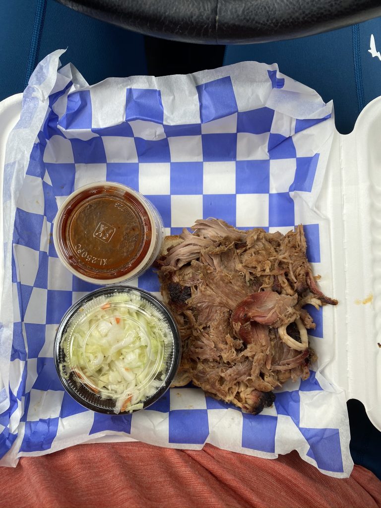 The route down to the falls was closed due to COVID, but we enjoyed the views up top for a few minutes. We got there at just the right time, because many cars pulled up as we were leaving. Twenty minutes down the road… I had planned for a BBQ break in Brevard, NC. Since we didn’t get any traditional North Carolina barbecue when we hiked Mount Mitchell in February (too tired!), I wanted to make it up to Joel. We pulled into the drive-thru of the small but mighty Blue Smoke BBQ around 11:30.